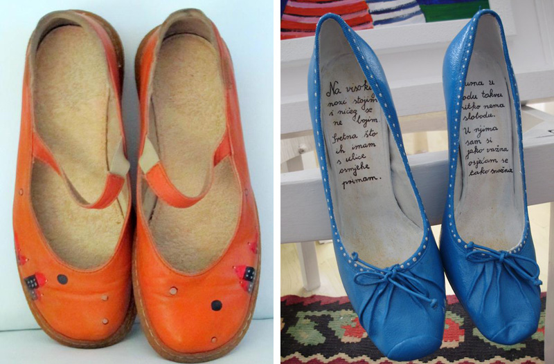 "Cipele ne kupujem u dućanima, doslovce ih pronalazim na sajmovima rabljene robe ili kod prijateljica. U želji da imam neke drugačije kreće oslikavanje. Svaku cipelu doživljavam kao priču, igram se bojama, tekstom, motivia! Kad se izgrebu ponovno ih vraćam u novi život i svaki puta imam opet NOVE! A kad se stvarno istroše uokvirim ih za uspomenu ili upotrijebim kao npr. ručkice na ormaru za cipele! S torbama i odjećom je vrlo slična priča.", Andreja.