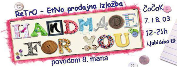 Izložba unikatnih ručnih radova, pod nazivom "ReTrO-EtNo", održaće se po treći put u Ljubićskoj 19 u Čačku. U martu mesecu izložba ili mini sajam rukotvorina će biti u znaku 8.marta, a u trajanju od dva dana(7. i 8. marta). Svi zainteresovani kreativci-rukotvorci koji žele da izlažu svoje radove mogu se prijaviti u inbox fb Petit Fiori ili na tel. 065/6759-331.