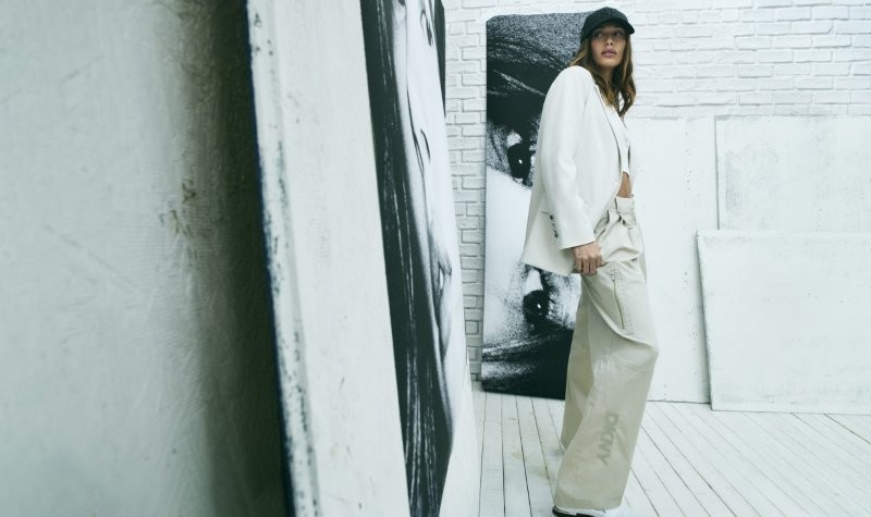 Koncept DKNY kampanje za proleće 2026 vodi nas u umetnički njujorški prostor za kreativne susrete i slobodan tok ideja. Hailey se pojavljuje u opuštenim, ali pažljivo stilizovanim kombinacijama: mantil i teksas košulja nošeni otvoreno preko slojeva koji prate liniju tela; krojene pantalone i mokasine u kontrastu sa brushalterom i predimenzioniranim topom; „naked“ haljina proslavljena u seriji Sex and the City, sada u crnoj verziji sa providnim bretelama, kao i mini-haljina u elegantnom prugastom dezenu; opuštene farmerke i blejzer koji prizivaju duh devedesetih. I naravno, tu je i New York Yankees™ kačket, nastao u saradnji sa DKNY brendom.