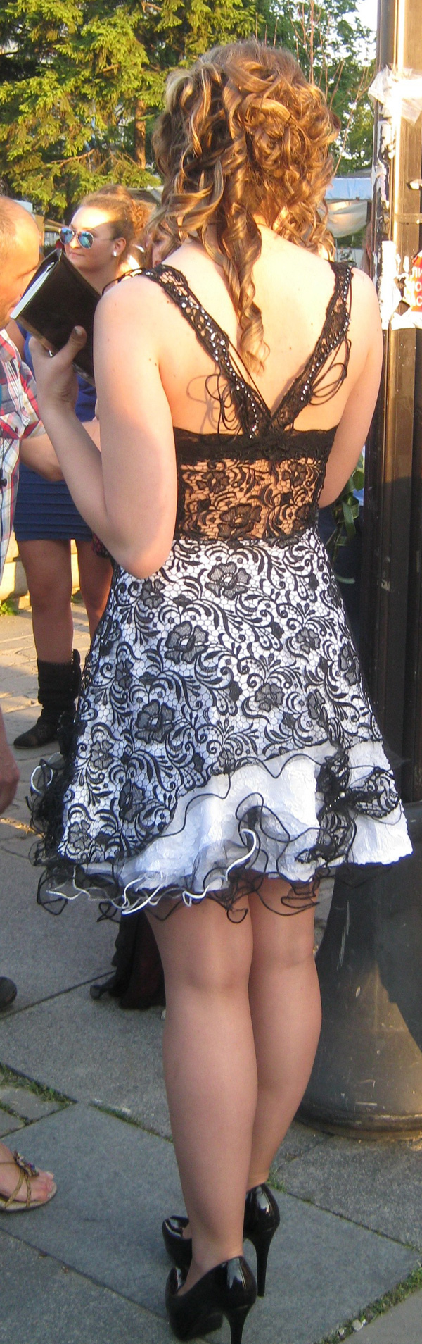 Crno bela svečana haljina izrađena je od francuske končane čipke, najfinije izrade. Donji deo izrađen je od više slojeva u kombinaciji sa belom svilom. Sofisticirana haljina obogaćena je sitnim cirkonima.