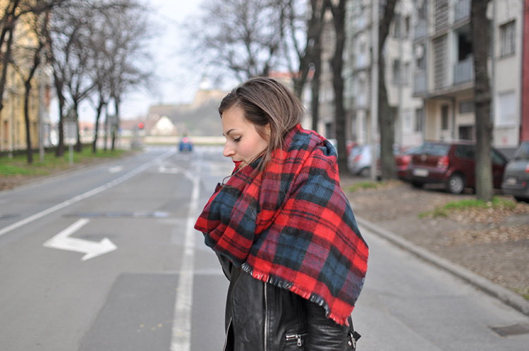 Milena Stanković se odlučila da u svom outfitu iskoristi Zara odeću i aksesoar. Usku suknju sa karnerom i Zara rokericu koji su u crnoj boji je razbila kariranom zimskom maramom. Ovo je jedna proverena varijanta jer je trenutno sve od ovih komada u trendu.