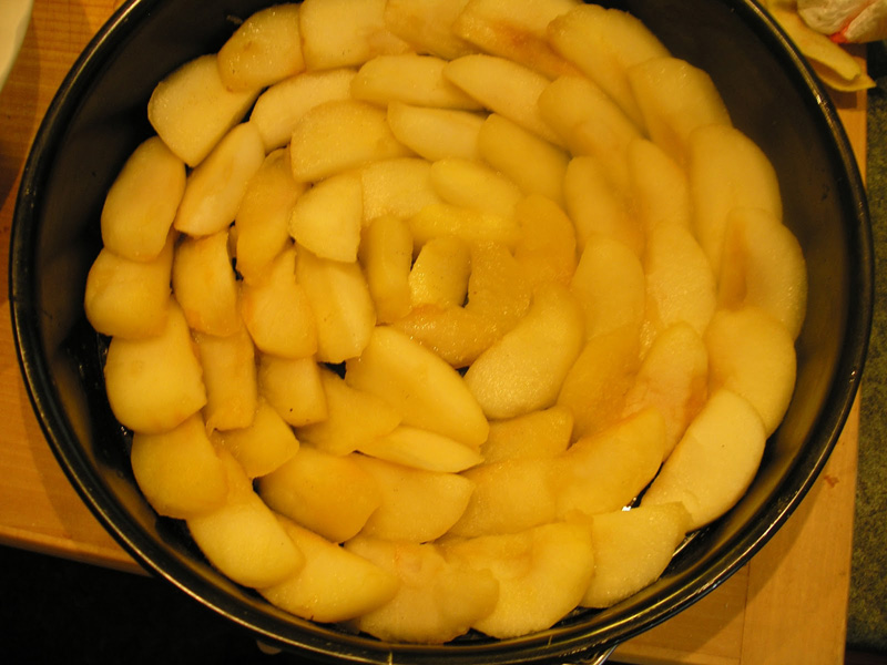 Jabuke poslažite u kalup za tortu, pa preko njih stavite sok s grožđicama i ostalim začinima. Na jabuke se stavlja prhko tijesto. Receptić za njega možete pogledati ovdje.